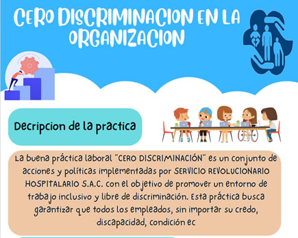 La buena práctica laboral «CERO DISCRIMINACIÓN» es un conjunto de acciones y políticas implementadas por SERVICIO REVOLUCIONARIO HOSPITALARIO S.A.C. con el objetivo de promover un entorno de trabajo inclusivo y libre de discriminación. Esta práctica busca garantizar que todos los empleados, sin importar su credo, discapacidad, condición económica, raza o sexo, sean tratados con igualdad y respeto en todas las etapas de su empleo